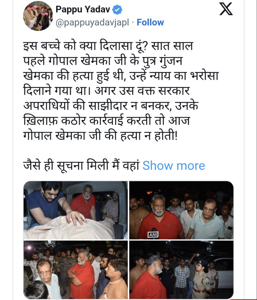 इधर घटना के बाद पूरे बिहार से राजनेताओं की अलग अलग प्रक्रिया सामने आ रही है। पूर्णिया से सांसद पप्पू यादव ने सरकार पर अपराधियों को सह देने का आरोप लगाया है। वारदात की जगह से गांधी मैदान थाना महज कुछ मीटर की दूरी पर है। पटना में इस तरह दिन दहाड़े गोली मारने की घटना से लोगों में असुरक्षा का माहौल है।