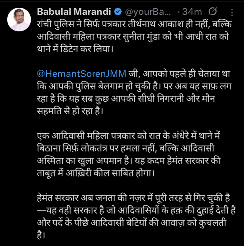 इधर घटना का विरोध करते हुए झारखंड के पूर्व मुख्यमंत्री बाबूलाल मरांडी ने X पर ट्वीट किया है। ट्वीट के माध्यम से उन्होंने राज्य की हेमंत सोरेन सरकार पर निशाना साधा है।